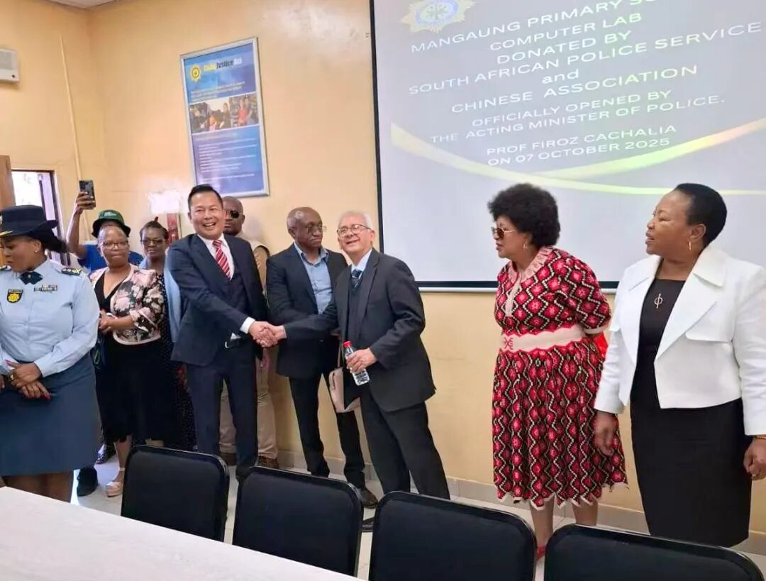 10 月7日,南非自由州省布鲁芳丹市曼加翁(Mangaung)小学洋溢着热烈的氛围,由自由州福建同乡会捐建的计算机教室启用剪彩仪式隆重举行。南非代理警察部长菲罗兹・卡查利亚、自由州省省长马奎恩・马泰、南非国家警察总监马塞莫拉等出席,并共同见证这一承载中南友谊的公益时刻。