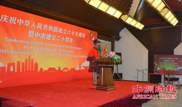 祖鲁在致辞中代表南非政府和人民热烈祝贺中华人民共和国成立69周年。祖鲁赞同林大使对南中、非中关系的积极评价,盛赞中非合作论坛北京盛会和中国对非政策,认为中国使馆组织两国青少年合唱两国国歌充分显示两国友谊已深入人心、后继有人。祖鲁说,今年恰逢南中建交20周年和曼德拉诞辰100周年,年内两国元首成功互访,引领南中政治互信、经贸合作、人文交流实现了新发展。南非是中国在非洲最重要的贸易伙伴,两国在中非合作论坛、金砖和“一带一路”框架下密切协作,合作成果丰硕。南方赞赏中方支持非盟《2063年议程》和南非经济社会转型的努力,感谢中国企业对南发展所做积极贡献,期待更多中国人和企业来南旅游和投资兴业。
