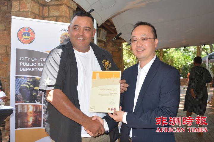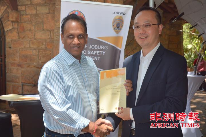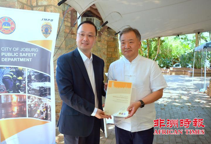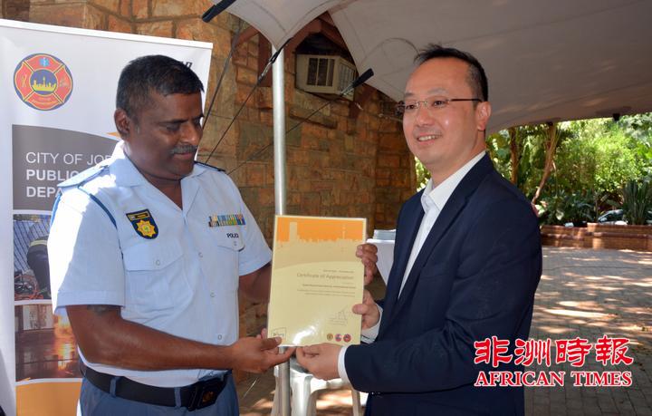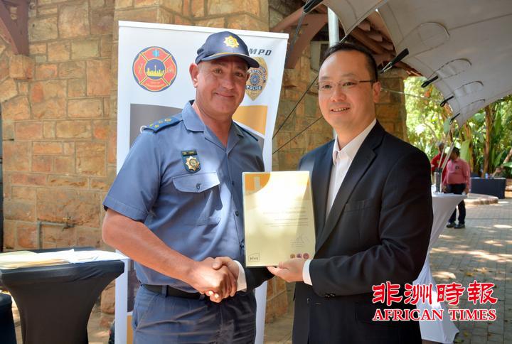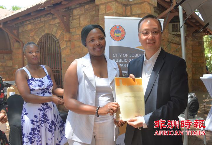当天,全非洲女企业家工商联合总会还向约翰内斯堡公共安全局捐赠了一批警用手电。孙耀亨局长向长期以来支持约翰内斯堡公共安全局工作的单位分别颁发了感谢证书。