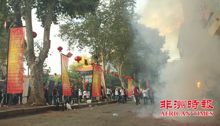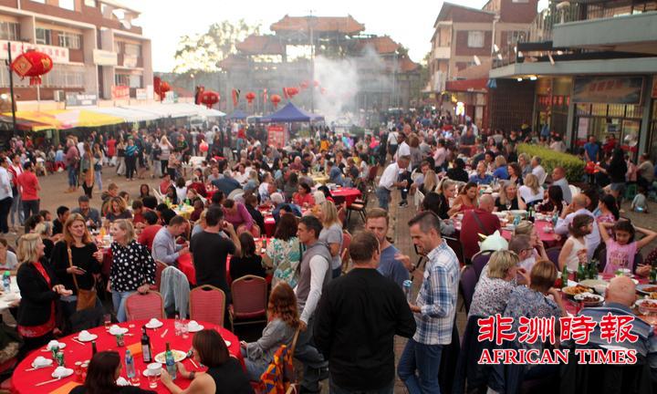 今天的约堡唐人街张灯结彩、锣鼓喧天、龙腾狮舞、鞭炮齐鸣、烟花漫天,到处都洋溢着中国农历新年的欢乐气氛。随着夜幕的降临,这条600多米长的街道已经被布置的格外耀眼。与往年相比,最大的亮点是唐人街管委会在主街道的一侧搭建了表演舞台,邀请了300多名嘉宾观看演出、品尝美食。