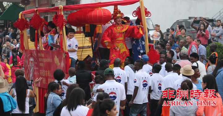 伴随着阮平总领事、孙耀亨局长、李新铸主任等上台为雄狮点睛,当晚的庆祝盛会正式拉开大幕。南华寺天龙队组织当地女性表演的中华传统节目战鼓表演获得满堂喝彩,舞龙舞狮表演让观众们层层围观,由华人华侨组织的腰鼓队和秧歌队表演吸引了众多的人们录像和拍照。同时,今年唐人街大拜年活动特别出彩的是贵州茅台酒集团、贵州茅台酒进出口公司、极速集团赞助,万福来超市承办的花车大巡游活动,这台花车被大红灯笼、贵州茅台酒背景、红彩绸和中国结装饰的十分喜庆,吸引了许多的观众驻足观看,而在花车上,身着中国各民族传统服饰和财神扮相的艺术团团员们以及茅台和极速的销售人员成为了当晚的又一个亮点,他们在进行花车巡游时不断的向簇拥过来的民众们散发糖果,围观者们脸上洋溢的幸福感不言而喻。于此同时,花车还不时停下来,唱起了喜庆的歌曲,跳起了欢快的舞蹈,与当地民众一起玩嗨唐人街,着实让南非民众感受了中国春节的喜庆和中国文化的魅力。