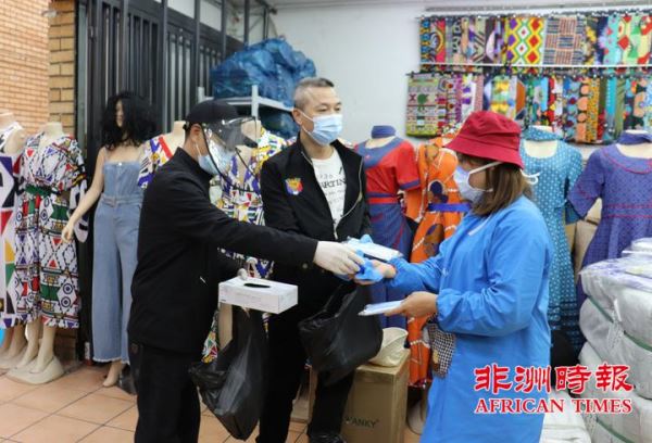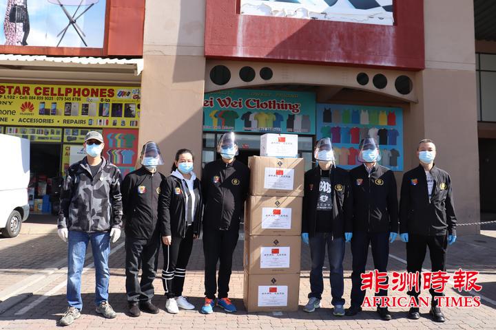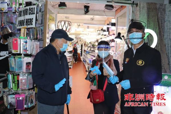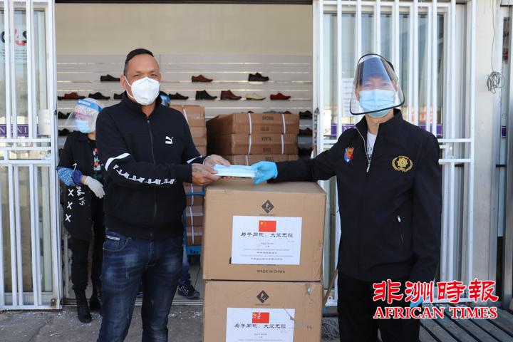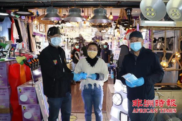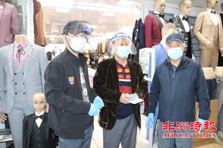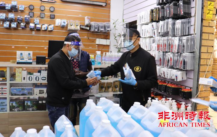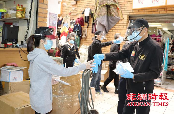 当天,南非华人警民合作中心主任李新铸,常务副主任朱怡苑、郑星利、副主任委员杨斯淞、张钊、黄宝烈,执行长谢宇航等前往中国商贸城、中非商城、香港城、百家商城和非洲商贸城,将这批手套和口罩分发给华人商家。