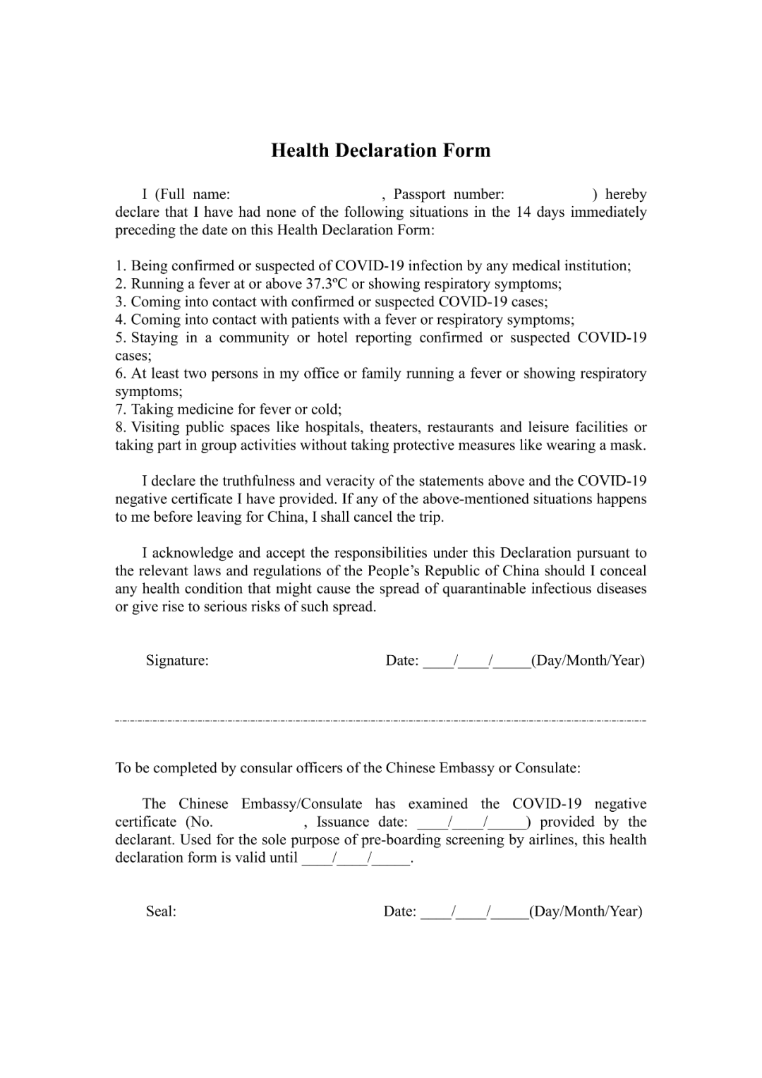 (二)中国使领馆审核通过后,以电子邮件方式将健康状况声明书扫描件发还申请人,请申请人自行打印并携带至机场。执飞赴华直飞航班的航空公司将凭该航班起飞地中国使领馆核发的健康状况声明书验放乘客。请在健康状况声明书有效期内乘机,并在乘机时配合航空公司查验。建议届时同时携带纸质版检测报告备查。