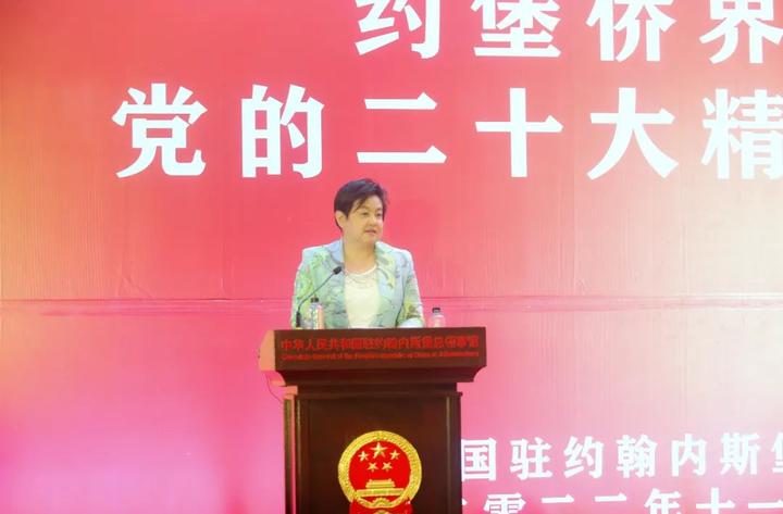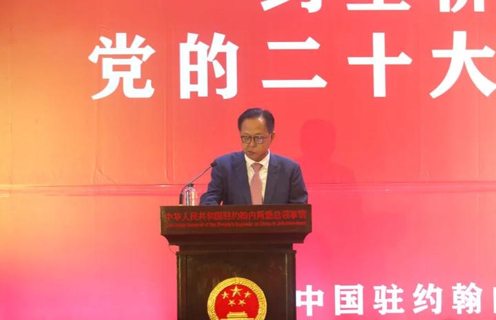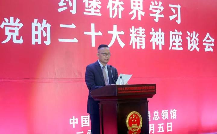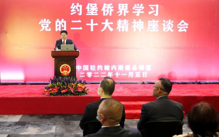2022年11月5日,驻约堡总领馆以线上线下相结合方式举办约堡侨界学习党的二十大精神座谈会。唐中东总领事出席并发表主旨讲话,周育江副总领事主持,约堡侨界七位代表发言,约120名侨胞代表线下参会。