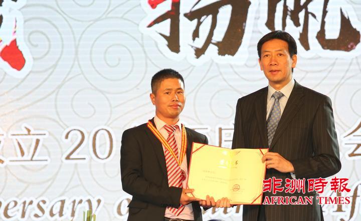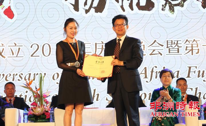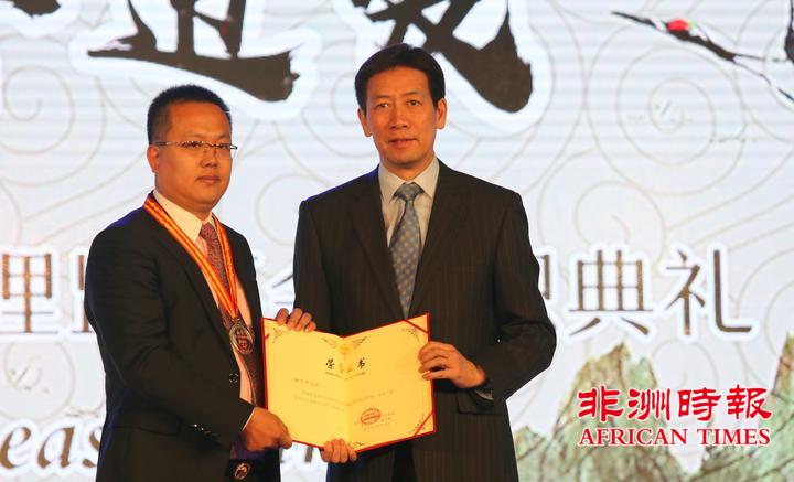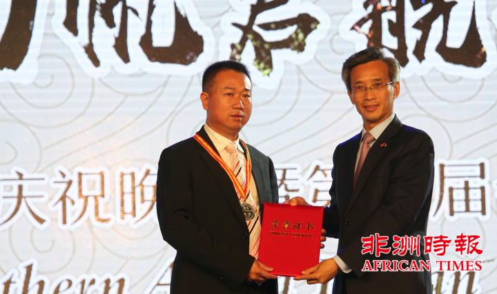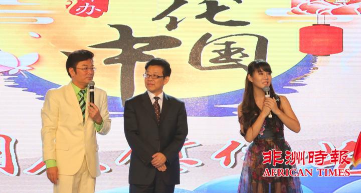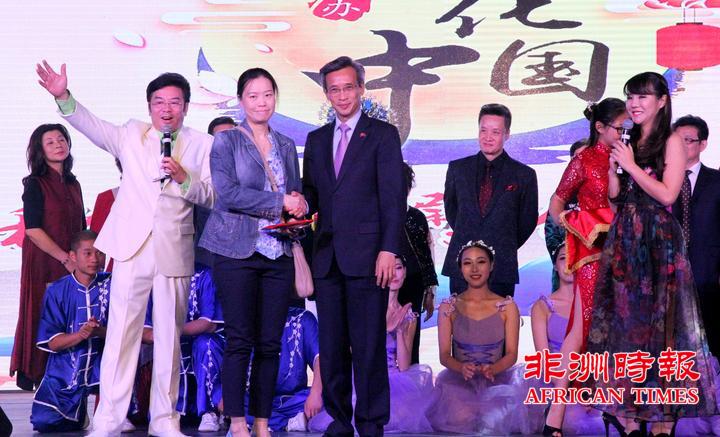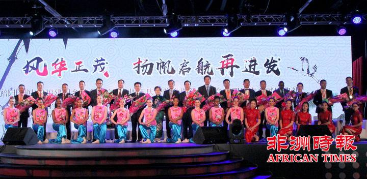 在就职典礼上,林松添大使向杨天峙会长颁发了第十届会长证书,同时,南部非洲福建同乡总会还向10名优秀干部颁发了特别贡献奖。当晚的庆祝晚会由国务院侨办组派的“文化中国”中秋国庆艺术团表演了精彩的文艺节目,来祝贺南部非洲中华福建同乡总会成立20周年暨第十届会长理监事会就职典礼的成功举办。演出特邀好莱坞首位华人双语节目主持人谢晓晔担任晚会主持人,晚会以南非国家艺术学校带来的舞蹈《步步高》拉开大幕,随后中南大学艺术学院的学生表演的民族舞蹈《吉祥飞天》,让观众感受到了敦煌莫高窟飞天女神的风采;著名歌唱家布仁巴雅尔和乌日娜先后演唱了《敖包相会》、《春天来了》,仿佛把观众带到了美丽辽阔的内蒙古大草原;紧接着,少林延泽演艺团现场表演的《太极神韵》,铁路文工团现场表演《双人对手顶》, 魔术师沈娟表演的魔术《天女散花》等轮番上阵,节目惊喜连连,同时,梅派第三代传人胡文阁还表演了京剧《贵妃醉酒》、《梨花颂》, 著名歌唱家王丽达现场演唱了《浏阳河》、《亲吻祖国》等曲目;而国家一级演员阎维文一出场便赢得现场3000多人震耳欲聋的掌声和欢呼声,他先后演唱了《洪湖水浪打浪 》、《母亲》、《想家的时候》、《小白杨》、《一二三四歌》及《举杯吧朋友》,使晚会达到了高潮。 (非洲时报 孙想录)