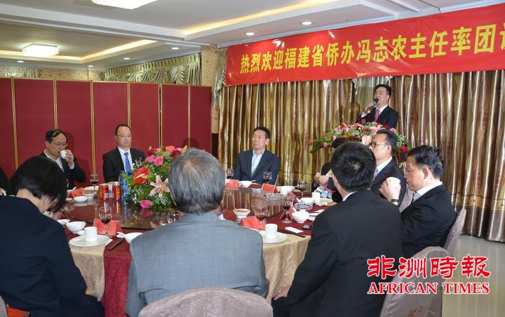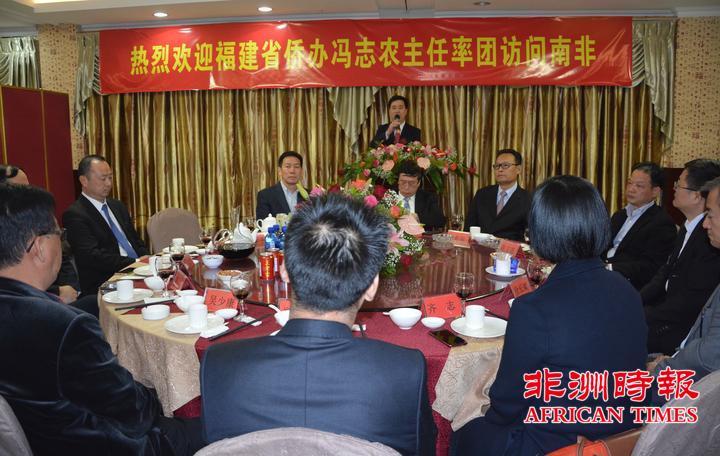 6月12日,南部非洲中华福建同乡总会在约翰内斯堡设宴,欢迎由福建省侨务办公室冯志农主任率领的侨务代表团一行。中国驻约翰内斯堡总领事阮平,约翰内斯堡市公共安全局局长孙耀亨,全非洲中国和平统一促进会会长、南非华人警民合作中心主任李新铸等出席。