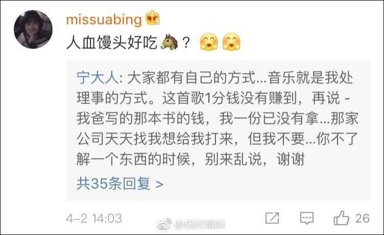 这首歌也在2日被网友扒了出来。结合视频突然走红一事,有人觉得宁大人在吃“人血馒头”: