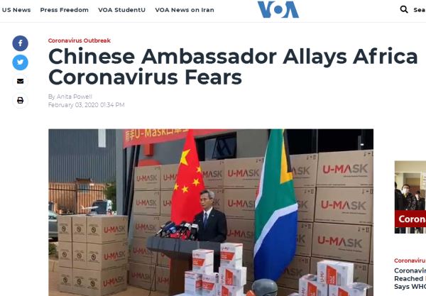 2月3日,中国驻南非大使林松添在使馆举行记者会,介绍武汉爆发新型冠状病毒肺炎最新疫情进展、中国政府果断、有效采取重大应对举措与积极成效等。30多家中南和国际媒体出席并广泛报道记者会。当天,美国之音以“中国大使安抚非洲对新型冠状病毒的恐慌情绪”为题刊发报道,主要内容如下: