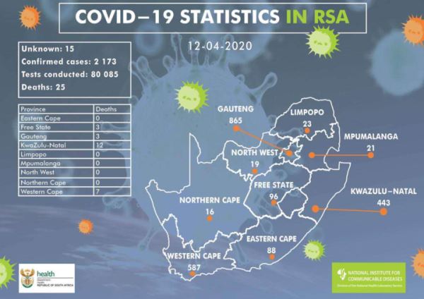 南非卫生部长兹韦里·姆赫兹(Zweli Mkhize)周日晚间宣布,该国新冠肺炎疑似病例累计检测80 085例,新增145例,全国累计确诊2173例。