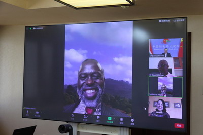 2020年10月23日,驻南非大使陈晓东视频会见南非约堡大学校长特斯利兹·马瓦拉教授。