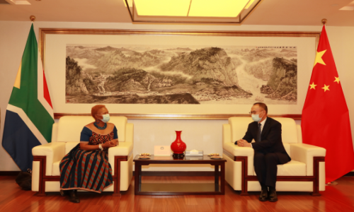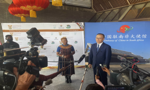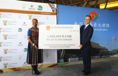 2022年4月20日,驻南非使馆同南非社会发展部举行救灾捐款仪式。驻南非大使陈晓东,南非社会发展部长、非国大国际关系委员会主席祖卢等出席。