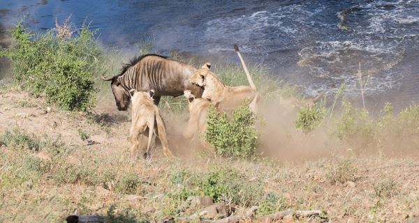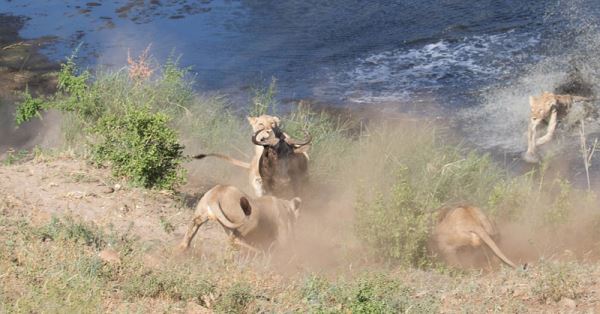 角马的腿由于水流的阻碍不能前进,结果再次被包围,四只狮子爬到它的背上把它拖进水里。