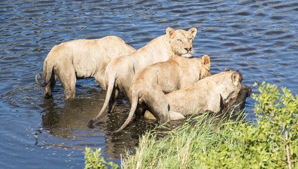 可惜,落单的它抵不住狮群的攻击。四只母狮从各个方向围住了它,抓着它的臀部和腿,试图把它拖下水。