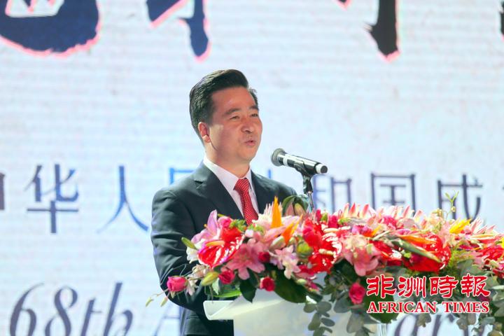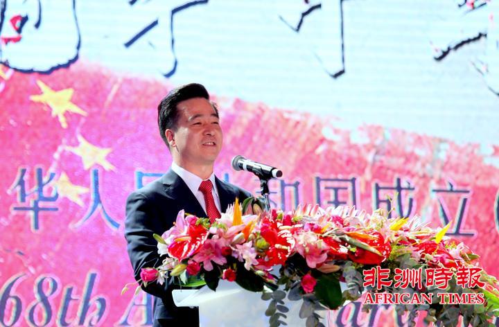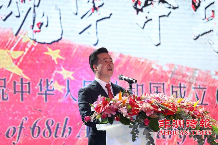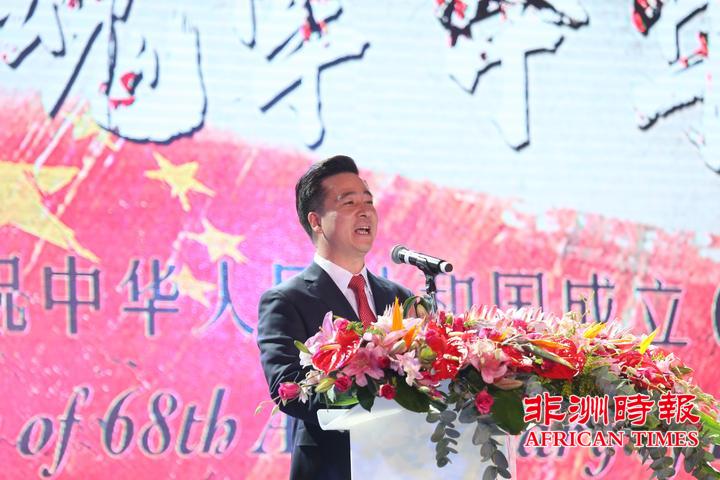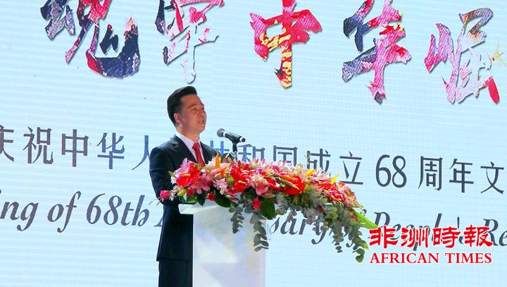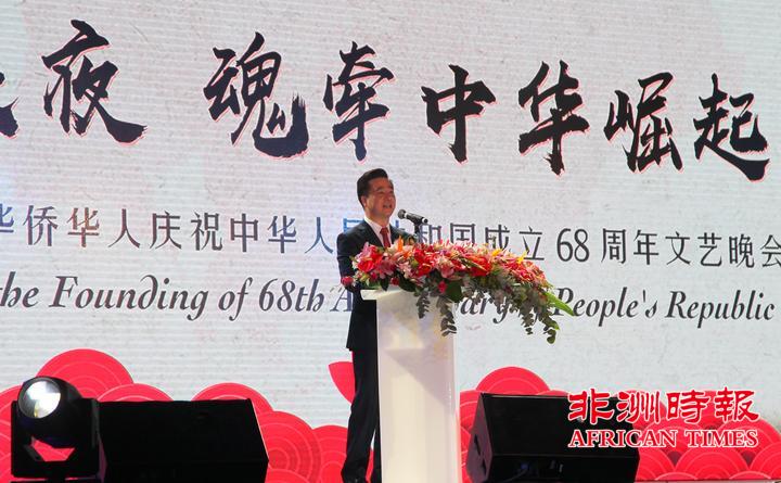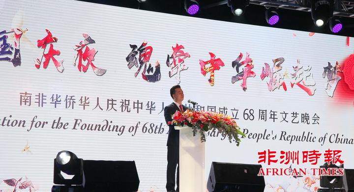 9月30日,南非华侨华人在约翰内斯堡举办大型文艺晚会,热烈庆祝中华人民共和国成立68周年,南部非洲中华福建同乡总会会长杨天峙发表热情洋溢的讲话。