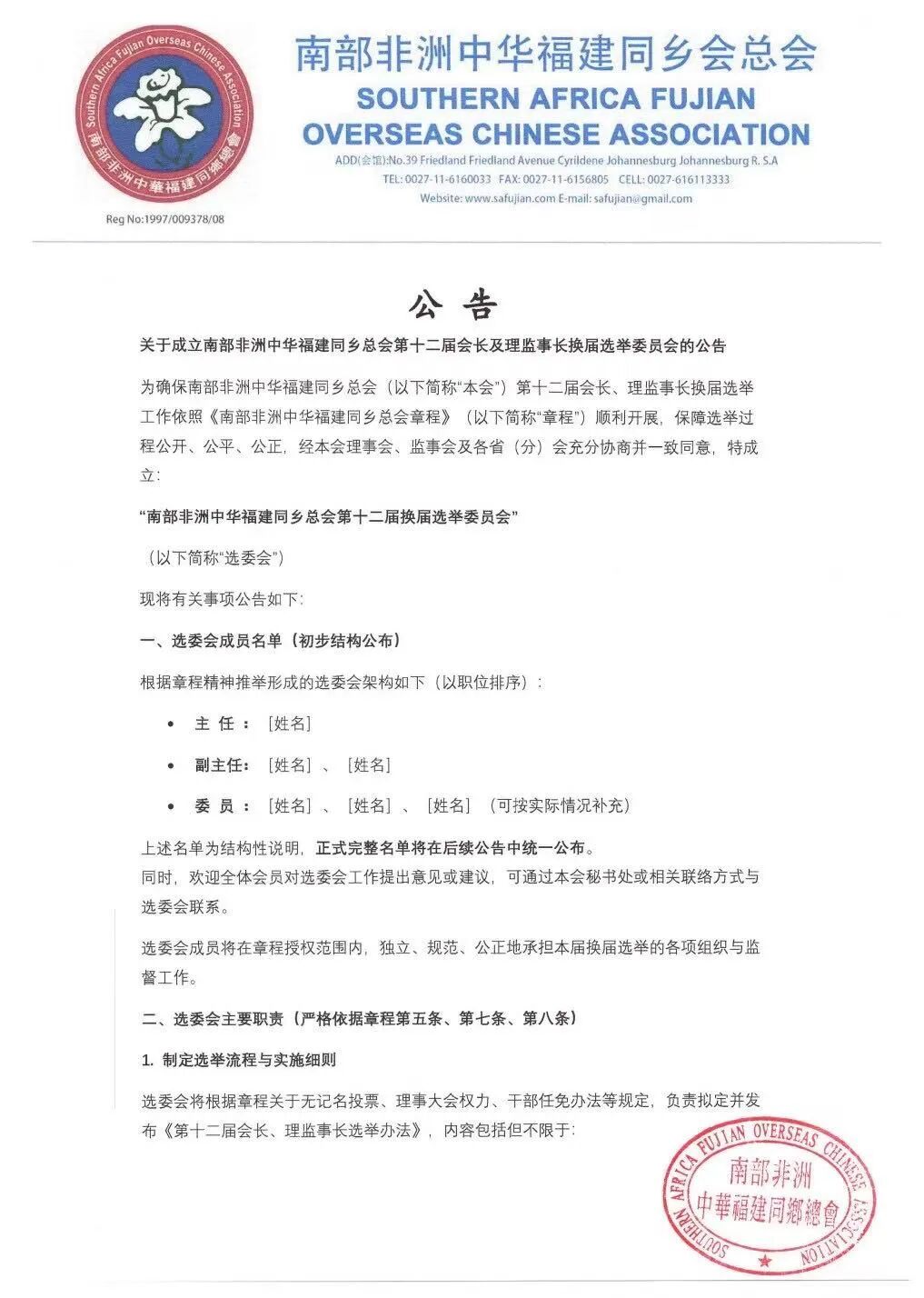 南部非洲中华福建同乡总会公告
