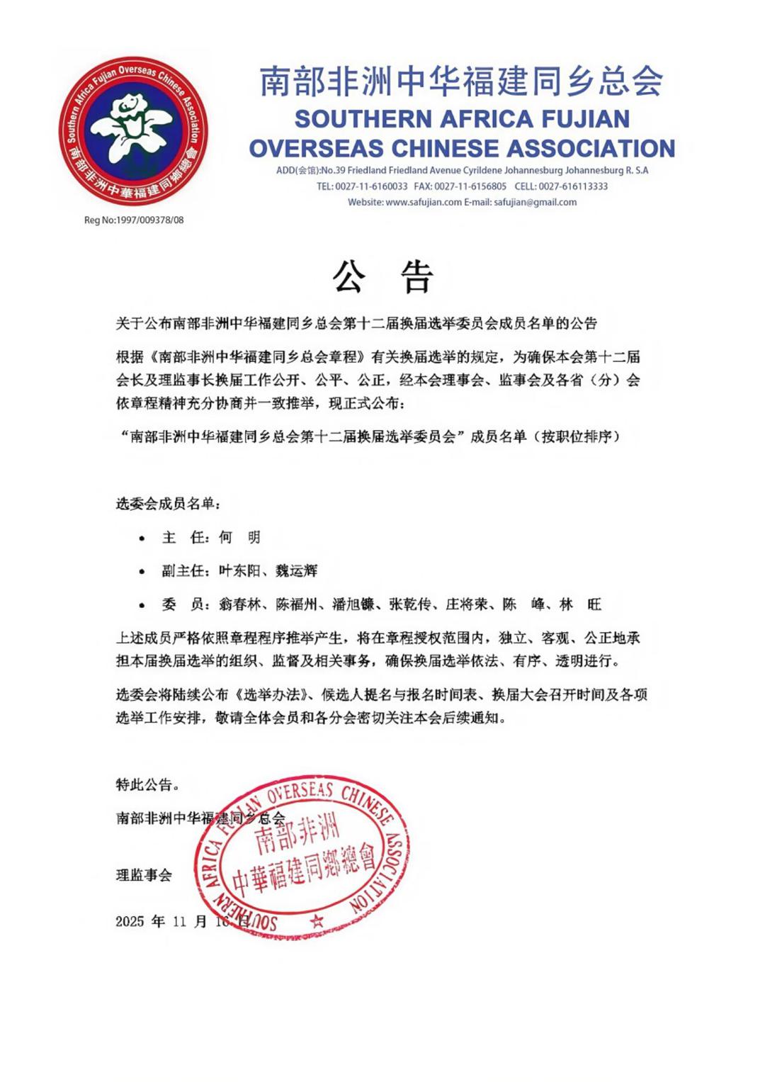 南部非洲中华福建同乡总会 - 换届选委会名单公告