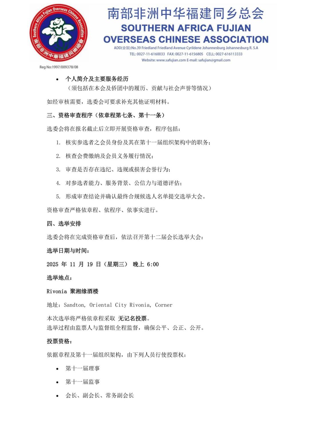 南部非洲中华福建同乡总会 -参选报名及选举安排的通告