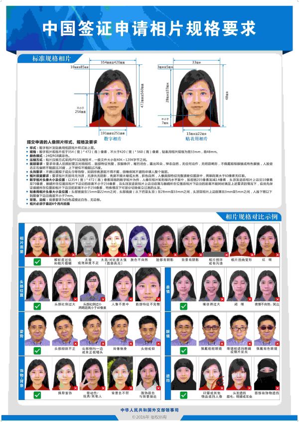 自2017年1月1日起,申请中国签证须提交符合规格要求的相片。详细要求参见附件。