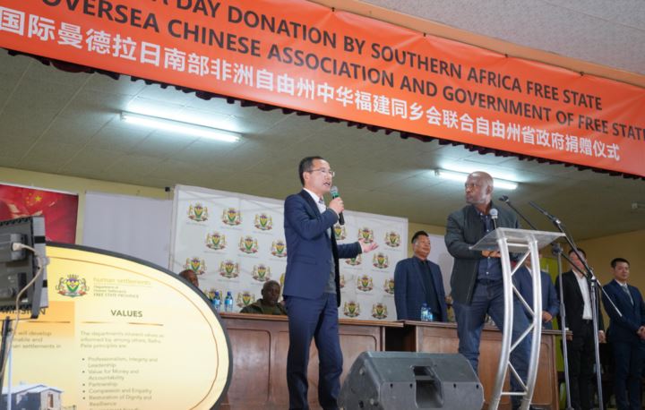 石会长特别感谢驻约堡总领馆周副总领事专程来参加这场意义重大的慈善捐赠活动,这充分体现了总领馆对自由州福建同乡会的关心和支持,对自由州民众的时刻关注;此外,他还对自由州省杜克瓦纳省长和各政府部门一直以来给予自由州华侨华人的支持表达谢意。