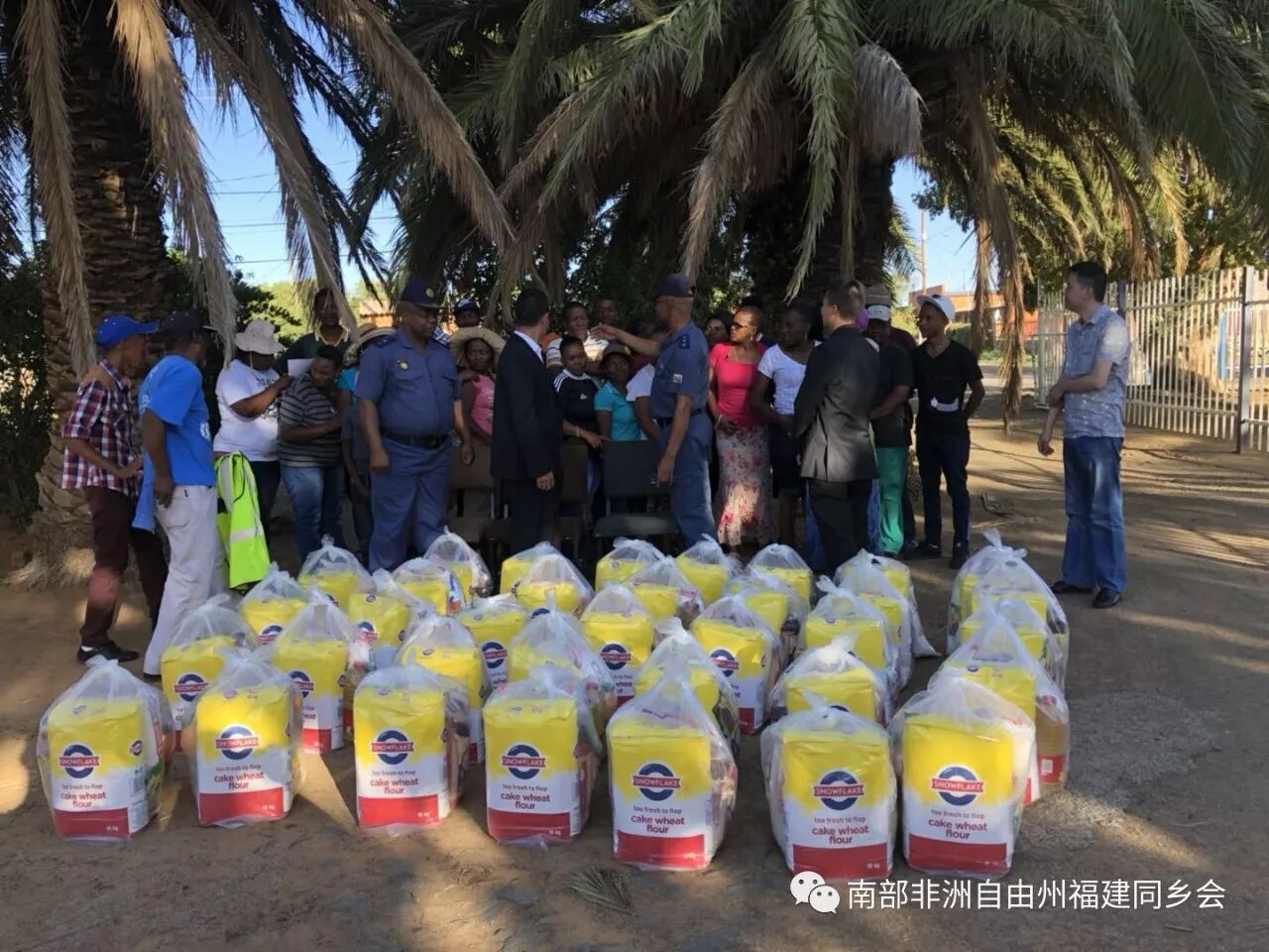 2017年12月31日,由驻约堡总领事馆自由州领事保护员发起的针对警察局警民合作巡逻队的捐赠仪式在自由州Hennenman地区举行,该捐赠是为了表达该警民合作巡逻队长期以来对该地区无偿义务的感谢,感谢他们付出了大量的时间与精力,为地区治安提供的帮助。自由州Hennenman地区警察局局长Ntombela与领保员翁雪平,领保员黄勇华,自由州福建同乡会副会长卢清,一起出席捐赠仪式。