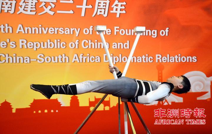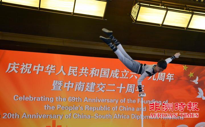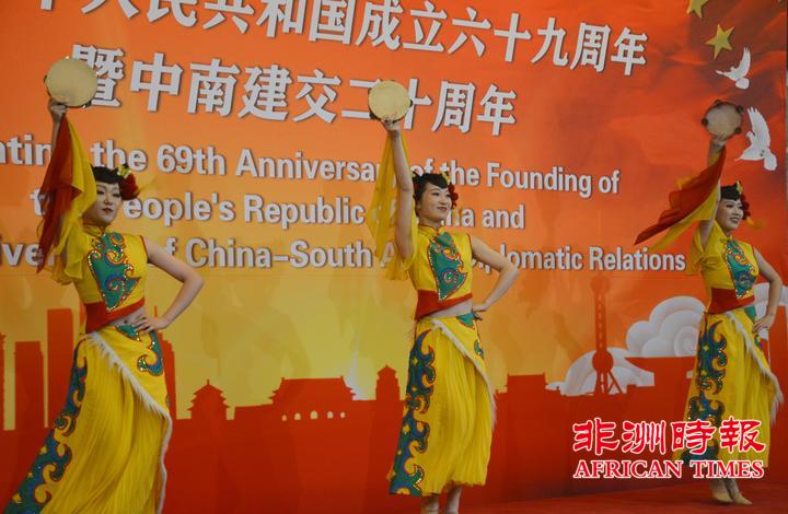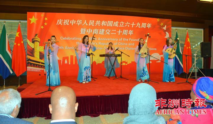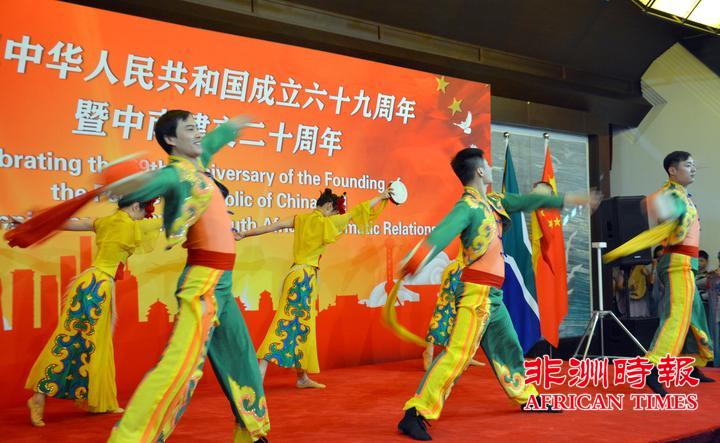 招待会上,驻南非使馆精心组织了中南建交20周年图片展和中南科技创新合作成果图片展,滚动播放《中非合作新时代》宣传片,邀请南非当地儿童用非洲传统乐器马林巴琴演奏起欢快的迎宾和席间乐,并邀请山东歌舞团为来宾献上了民族舞蹈、器乐合奏、杂技、武术等精彩节目,受到来宾们一致好评。使馆还向出席招待会的来宾发放了南非主流媒体当日出版的《中国国庆特刊》以及介绍中国文化和中非友好的外宣品。