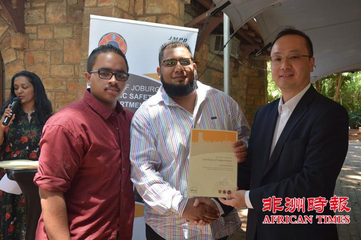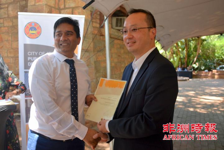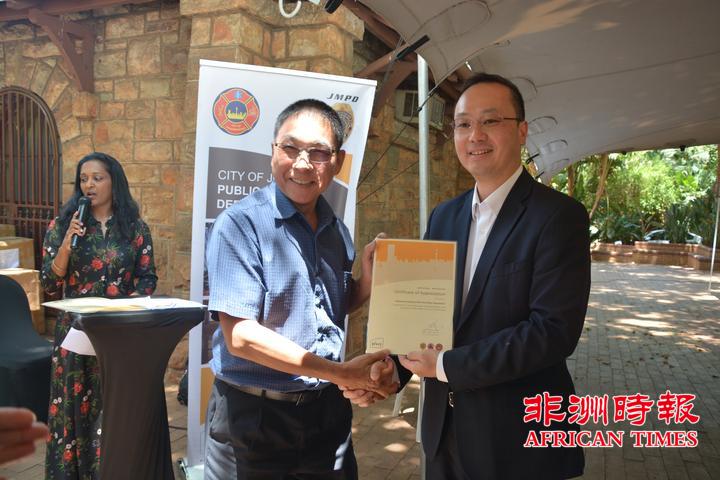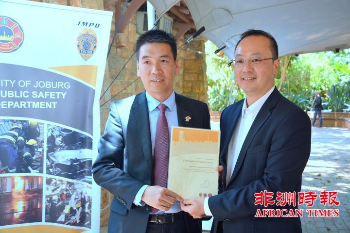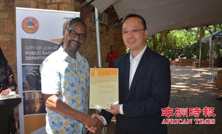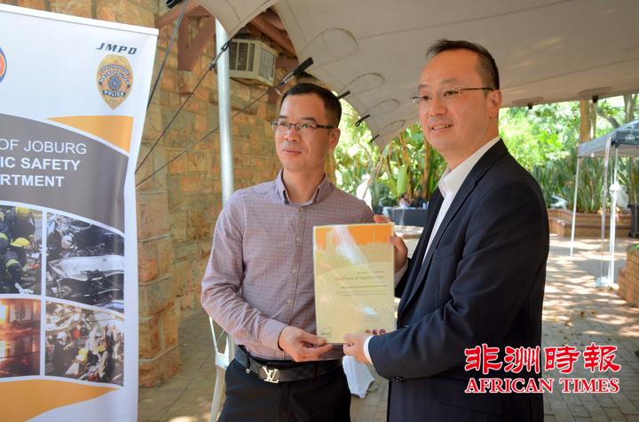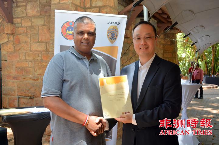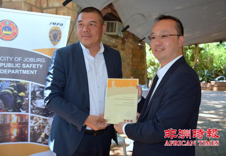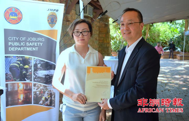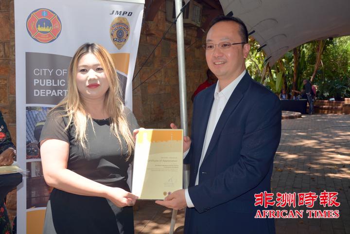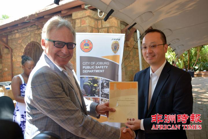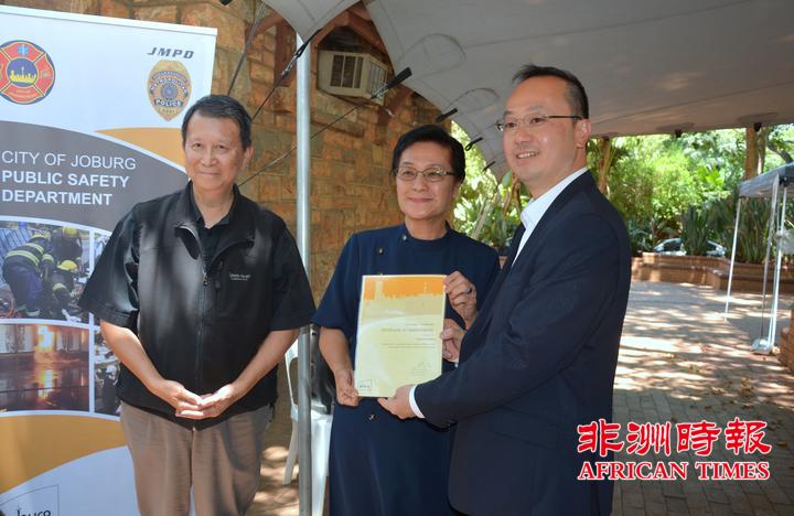 当天,全非洲女企业家工商联合总会还向约翰内斯堡公共安全局捐赠了一批警用手电。孙耀亨局长向长期以来支持约翰内斯堡公共安全局工作的单位分别颁发了感谢证书。