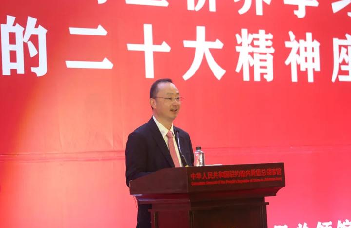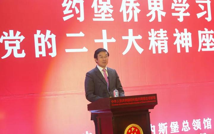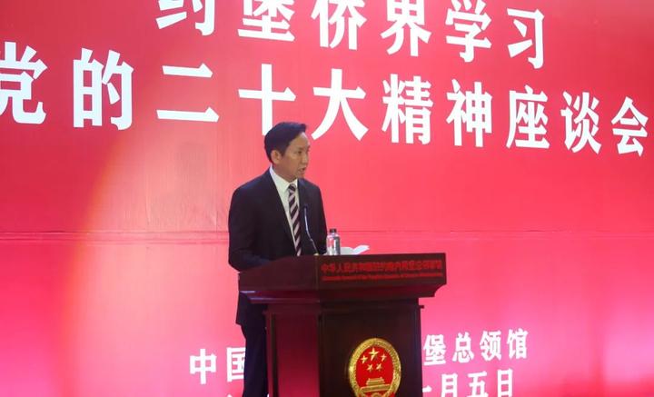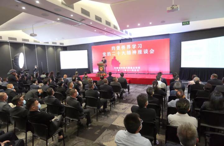 2022年11月5日,驻约堡总领馆以线上线下相结合方式举办约堡侨界学习党的二十大精神座谈会。唐中东总领事出席并发表主旨讲话,周育江副总领事主持,约堡侨界七位代表发言,约120名侨胞代表线下参会。