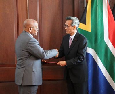 8月24日,中华人民共和国驻南非共和国特命全权大使林松添在南非总统宾馆向南非总统雅各布·祖马递交国书。双方就中南关系和促进双边友好合作等进行了亲切交谈。