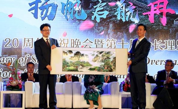 在就职典礼上,林松添大使向杨天峙会长颁发了第十届会长证书,同时,南部非洲福建同乡总会还向10名优秀干部颁发了特别贡献奖。当晚的庆祝晚会由国务院侨办组派的“文化中国”中秋国庆艺术团表演了精彩的文艺节目,来祝贺南部非洲中华福建同乡总会成立20周年暨第十届会长理监事会就职典礼的成功举办。演出特邀好莱坞首位华人双语节目主持人谢晓晔担任晚会主持人,晚会以南非国家艺术学校带来的舞蹈《步步高》拉开大幕,随后中南大学艺术学院的学生表演的民族舞蹈《吉祥飞天》,让观众感受到了敦煌莫高窟飞天女神的风采;著名歌唱家布仁巴雅尔和乌日娜先后演唱了《敖包相会》、《春天来了》,仿佛把观众带到了美丽辽阔的内蒙古大草原;紧接着,少林延泽演艺团现场表演的《太极神韵》,铁路文工团现场表演《双人对手顶》, 魔术师沈娟表演的魔术《天女散花》等轮番上阵,节目惊喜连连,同时,梅派第三代传人胡文阁还表演了京剧《贵妃醉酒》、《梨花颂》, 著名歌唱家王丽达现场演唱了《浏阳河》、《亲吻祖国》等曲目;而国家一级演员阎维文一出场便赢得现场3000多人震耳欲聋的掌声和欢呼声,他先后演唱了《洪湖水浪打浪 》、《母亲》、《想家的时候》、《小白杨》、《一二三四歌》及《举杯吧朋友》,使晚会达到了高潮。 (非洲时报 孙想录)