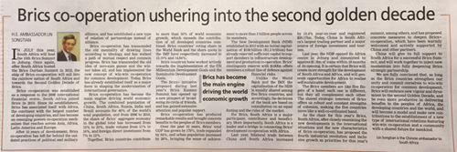 4月26日,中国驻南非大使林松添在南最大的平面媒体集团独立传媒旗下《星报》、《比陀新闻报》发表署名文章《金砖合作驶入第二个“金色十年”》。全文如下: