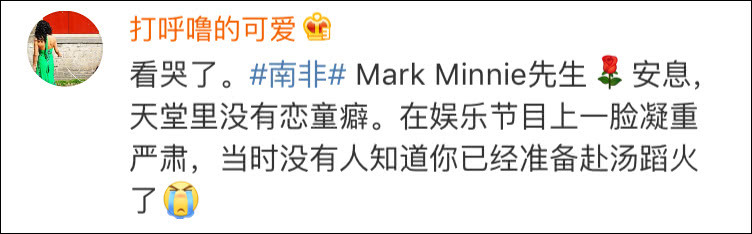 面对质疑,宁大人再度回应,还附上了一张南非民众在街头贴的牌子——“闵尼被誉为英雄、传奇”。“我用我爸的命蹭热度?开什么玩笑?“他反驳道,“我爸是唯一支持我的人,他走了,就剩我一个……你以为我爸火了我很开心?”
