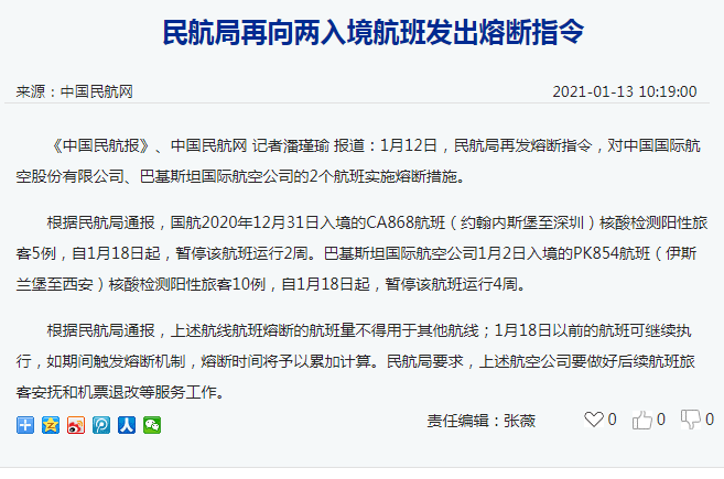 根据民航局通报,国航2020年12月31日入境的CA868航班(约翰内斯堡至深圳)核酸检测阳性旅客5例,自1月18日起,暂停该航班运行2周。巴基斯坦国际航空公司1月2日入境的PK854航班(伊斯兰堡至西安)核酸检测阳性旅客10例,自1月18日起,暂停该航班运行4周。