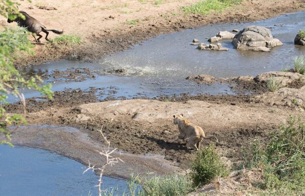 可怜的角马先是被狮群追逐,一路穿过了一片草原,然后被狮群围困在了位于南非东北部与莫桑比克边境的克鲁格国家公园的河边,它在河岸上窜来窜去,拼命逃脱。
