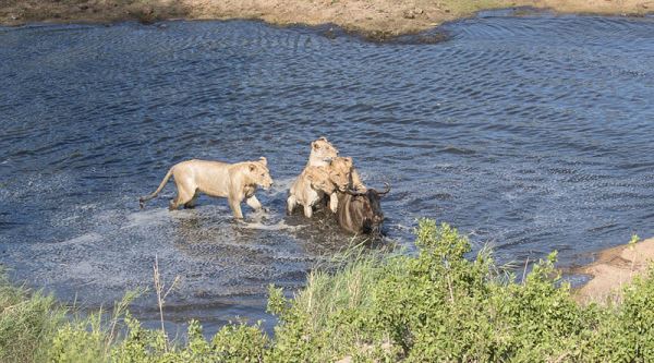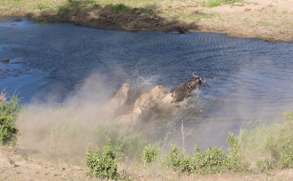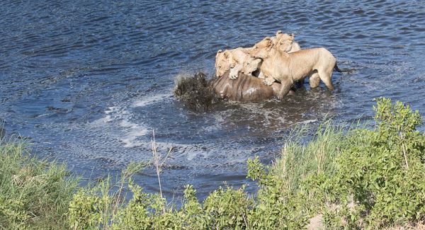 角马的腿由于水流的阻碍不能前进,结果再次被包围,四只狮子爬到它的背上把它拖进水里。