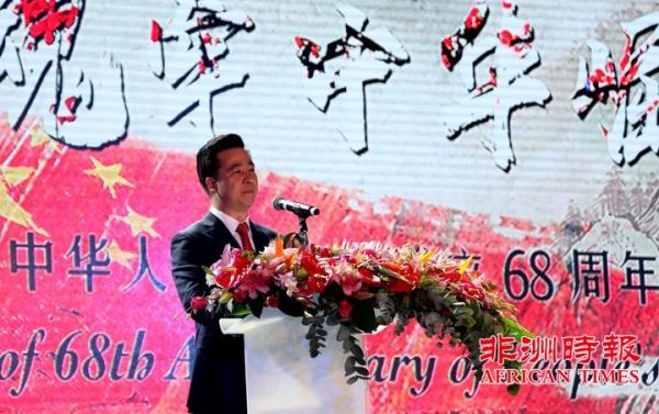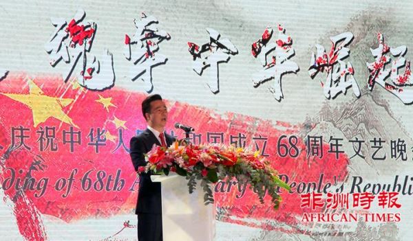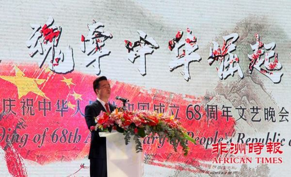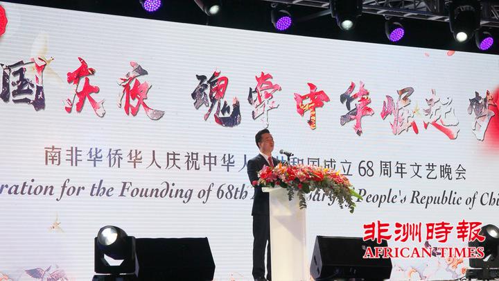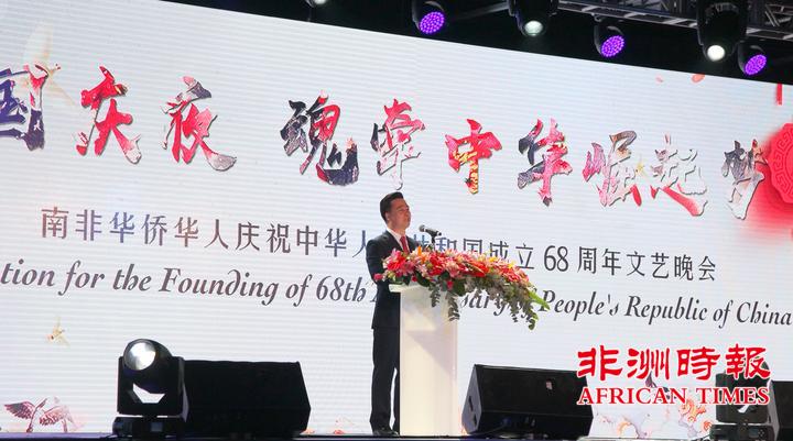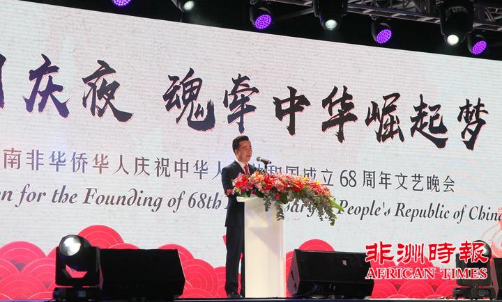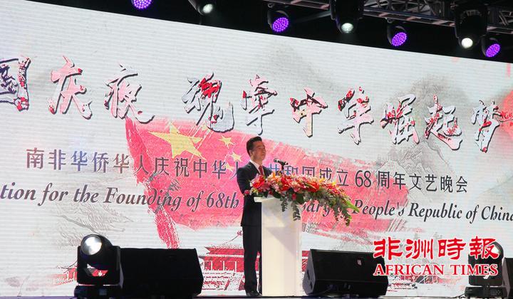 9月30日,南非华侨华人在约翰内斯堡举办大型文艺晚会,热烈庆祝中华人民共和国成立68周年,南部非洲中华福建同乡总会会长杨天峙发表热情洋溢的讲话。
