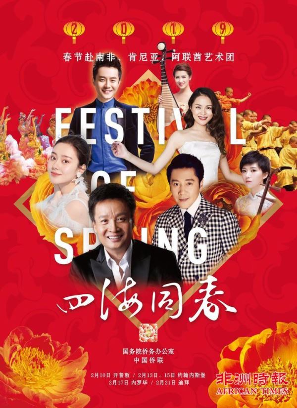 由中国国务院侨务办公室、中华全国归国华侨联合会主办,南非华人警民合作中心承办的四海同春2019年南非华侨华人新春晚会,于2019年2月13日、15日下午5点30在约翰内斯堡皇宫剧场精彩上演。著名歌唱家阎维文、蔡国庆等将赴约堡进行慰侨演出。