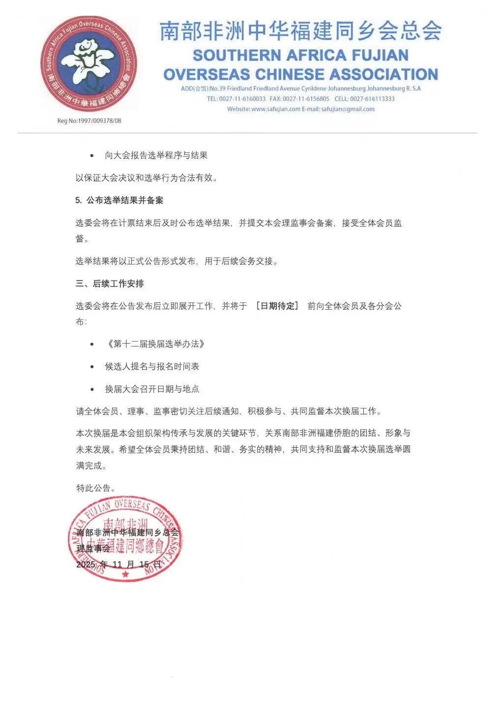 南部非洲中华福建同乡总会公告