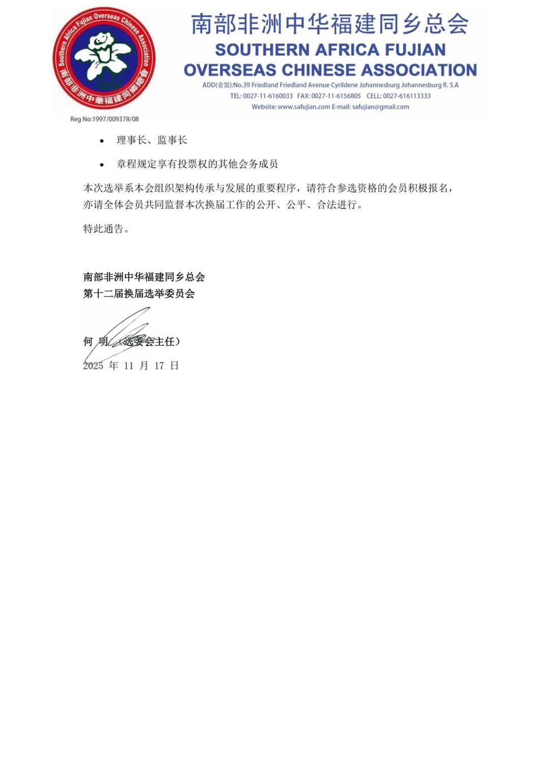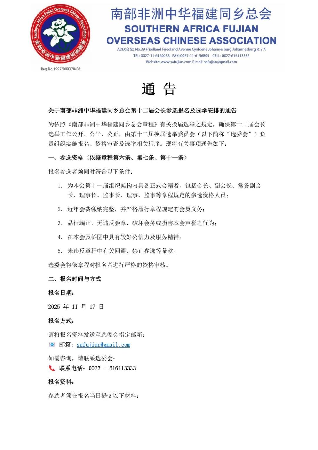 南部非洲中华福建同乡总会 -参选报名及选举安排的通告
