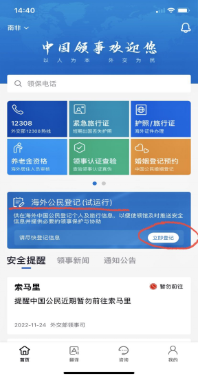 岁近年末,旅南侨胞即将迎来一系列当地和国内传统节假日。在这欢乐祥和的节庆假期,如何更好维护自己的人身和财产安全,是大家面临的一个重要问题。为充分发挥信息化手段优势,进一步帮助海外中国公民更好获得领事保护与服务,外交部“中国领事APP”近期推出了“海外公民登记”功能版块,已于11月28日全面上线。