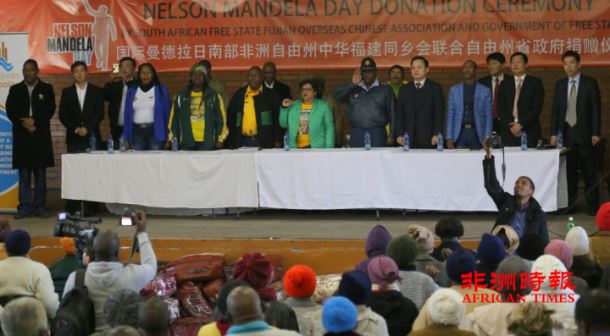 7月18日是国际曼德拉日,南部非洲中华福建同乡总会、自由州福建同乡会联合自由州省政府向萨索尔堡(Sasolburg)地区的250多户贫困家庭捐赠了一批慈善物资,总价值超过35万兰特,其中中国驻约翰内斯堡总领馆也为此次活动捐助了2万兰特,南部非洲中华福建同乡总会捐赠了8万兰特。